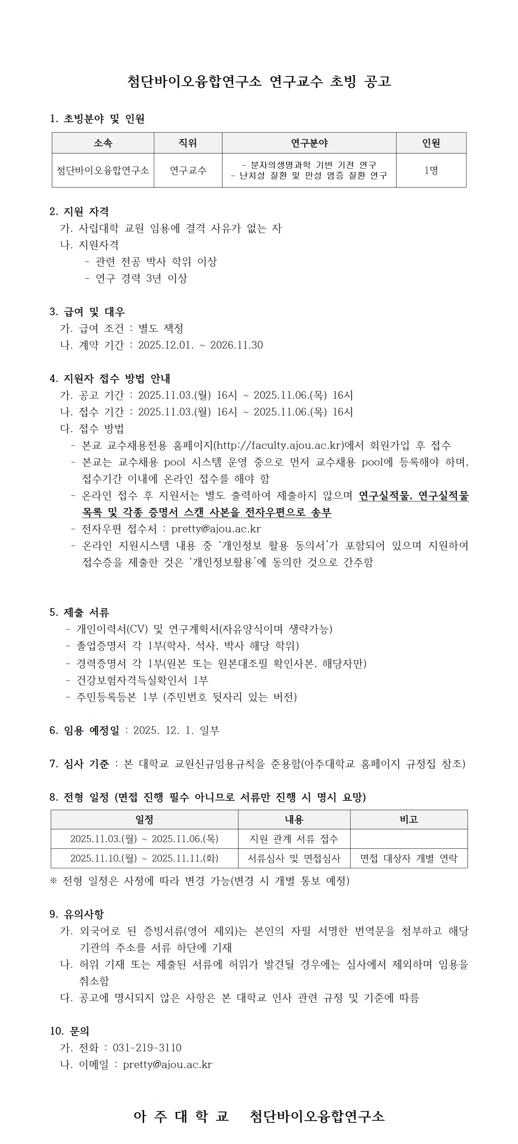 [공지] 2025학년도 2학기 아주대학교 첨단바이오융합연구소 연구교수 초빙 공고