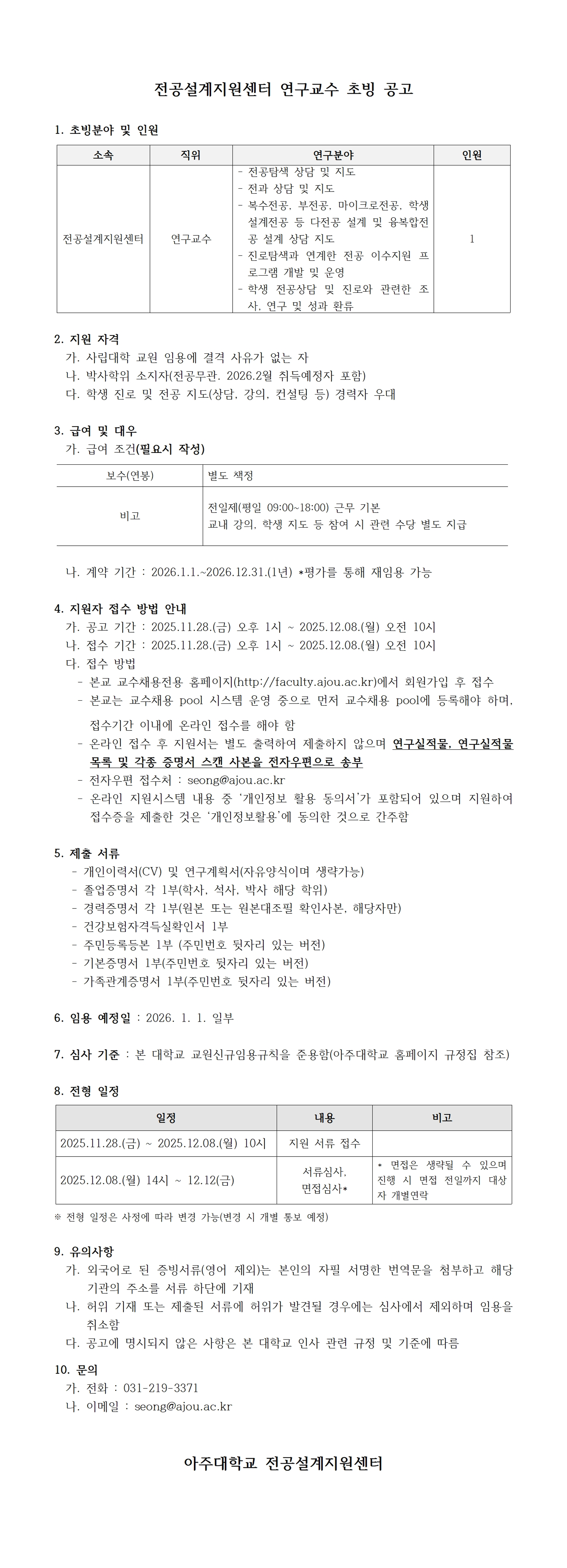 2025학년도 2학기 아주대학교 전공설계지원센터 연구교수 초빙 공고 (2026.01.01일자)