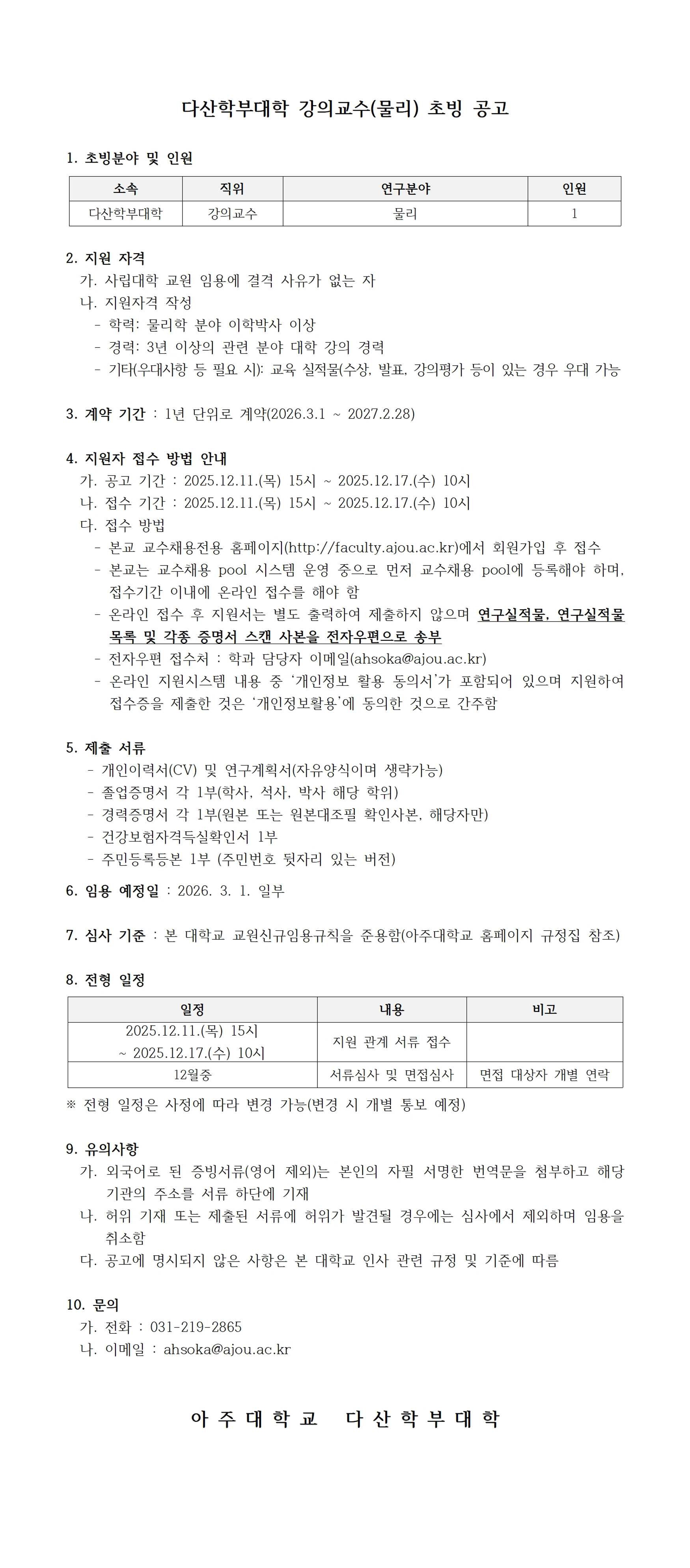 [공지] 2026학년도 1학기 아주대학교 다산학부대학 특별임용교원(강의교수-물리) 초빙 공고