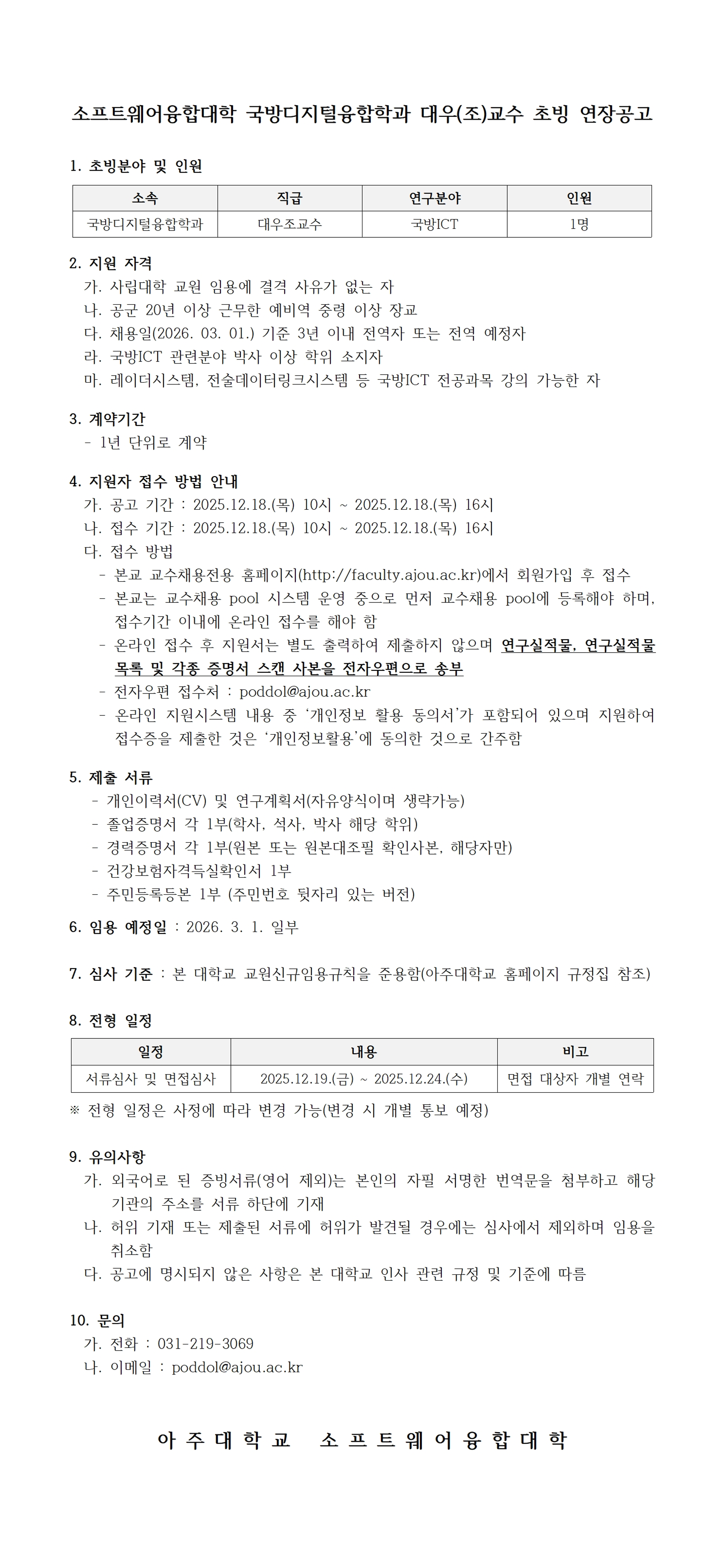 2026학년도 1학기 아주대학교 소프트웨어융합대학 국방디지털융합학과 특별임용교원(대우조교수) 초빙 연장공고