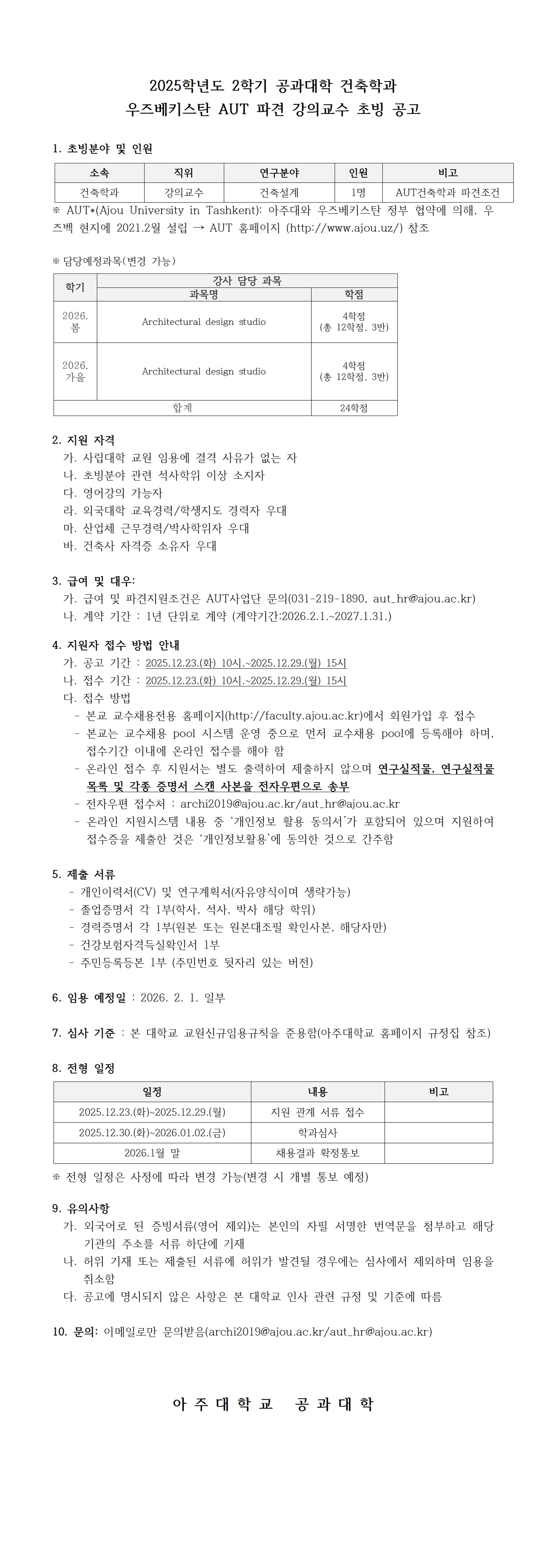 [공지] 2025학년도 2학기 공과대학 건축학과 우즈베키스탄(AUT) 파견 강의교수 초빙공고