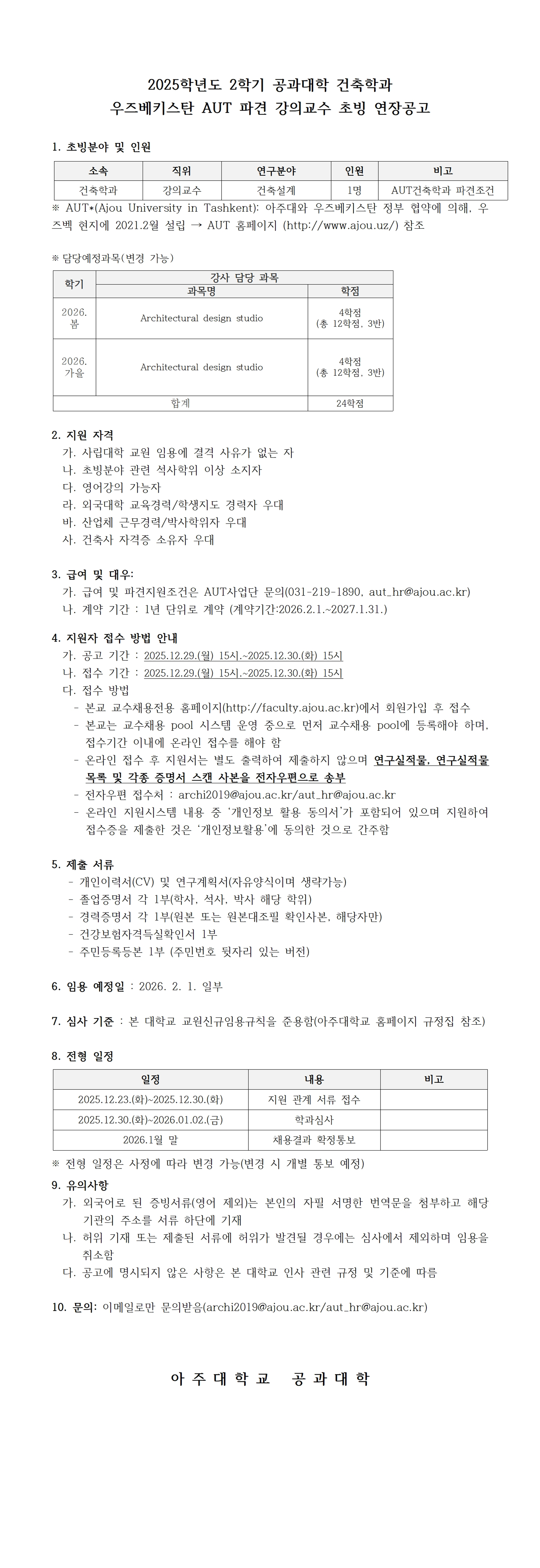 [공지] 2025학년도 2학기 공과대학 건축학과 우즈베키스탄(AUT) 파견 강의교수 초빙 연장공고