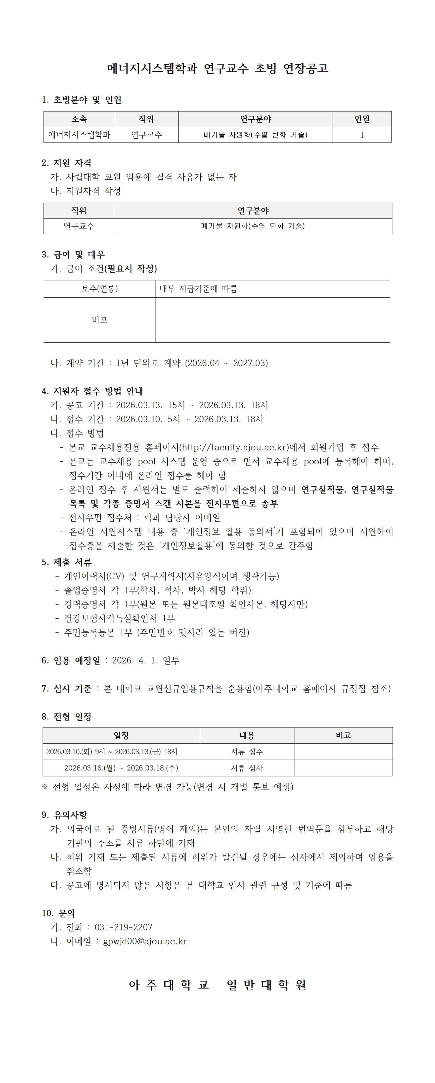 2026학년도 1학기 아주대학교 일반대학원 에너지시스템학과 연구교수 초빙 연장공고