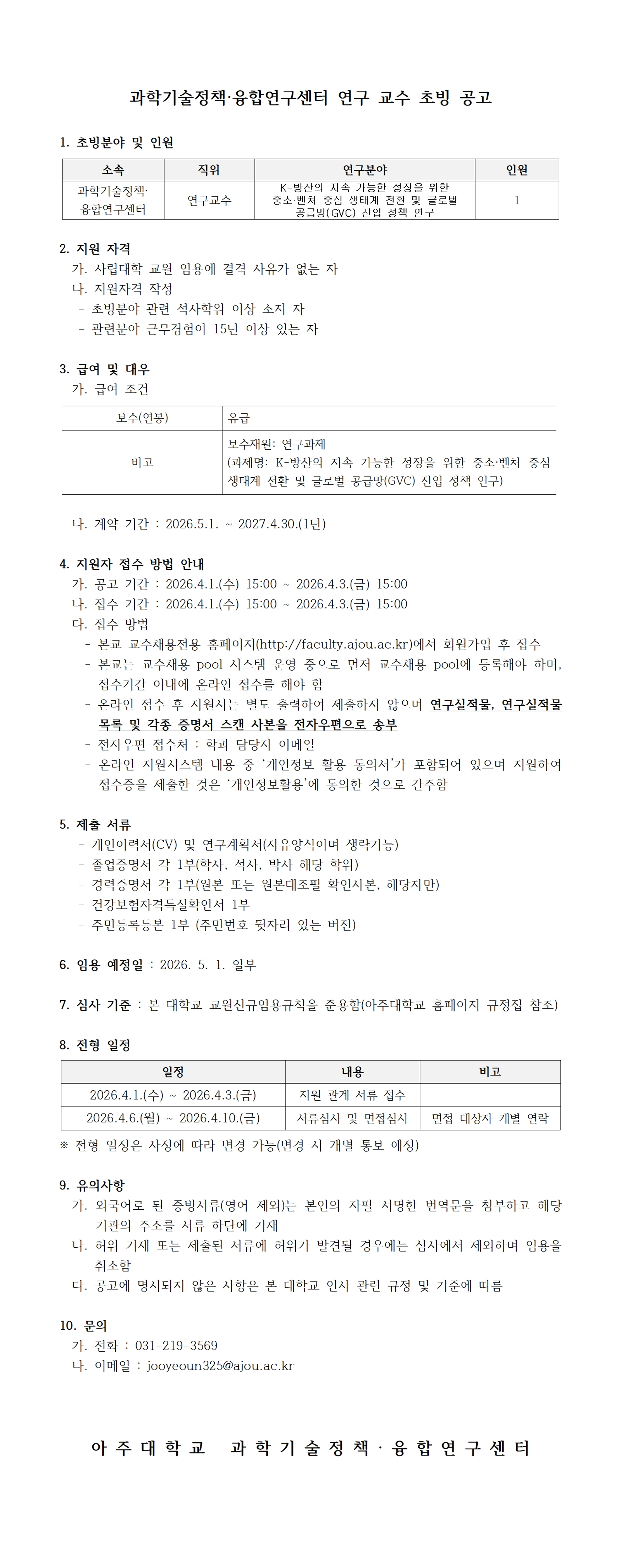 [공지] 2026학년도 1학기 아주대학교 과학기술정책융합연구센터 연구교수 초빙 공고 (2026.05.01일자)