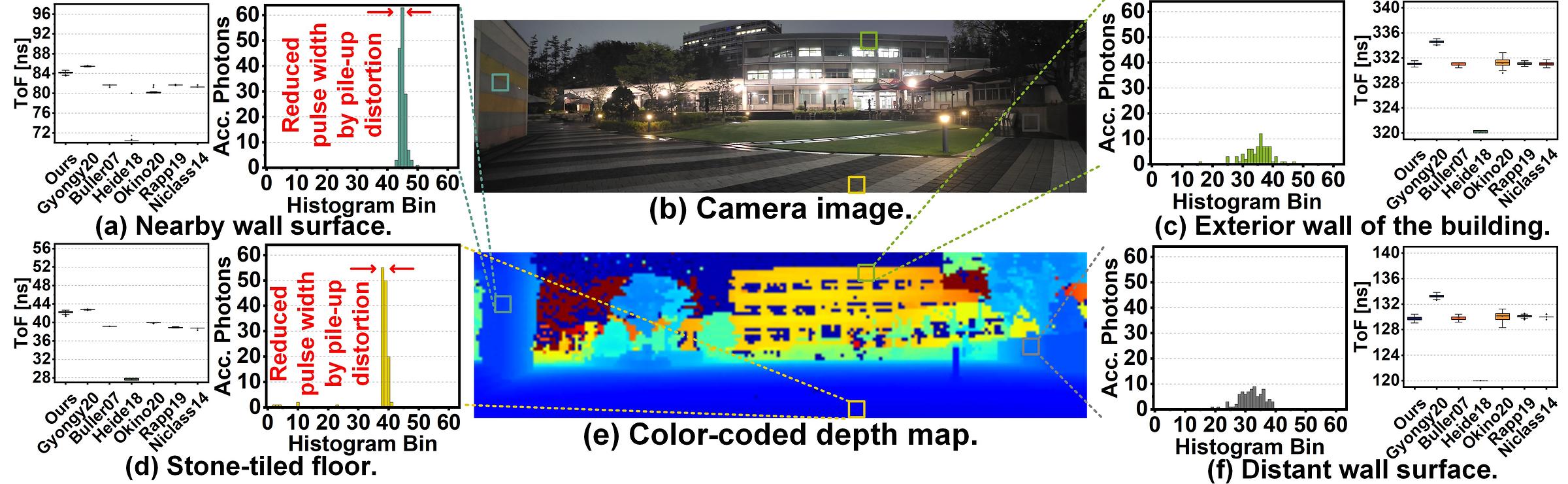 기존의 방식인 단일 광자 검출기(SPAD)를 통한 히스토그램 기반 거리 추정 방식의 경우, 근거리에서의 강한 반사로 pile-up 왜곡이 발생함을 알 수 있다.