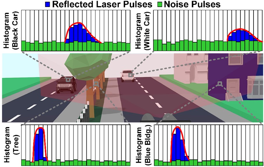 라이다(LiDAR) 센서를 통한 정확한 거리 측정을 위해서는 단일 광자 검출기(SPAD)를 이용한 히스토그램 기반 거리 추정 방식이 널리 사용되고 있다. 그러나 현재 활용되고 있는 거리 추정 방식은 강한 반사 신호 환경에서 발생하는 왜곡에 취약하고, 정확도를 높일수록 연산량이 급격히 증가해 실시간으로 반응해야 하는 하드웨어의 실제 구현에는 한계가 있다.
