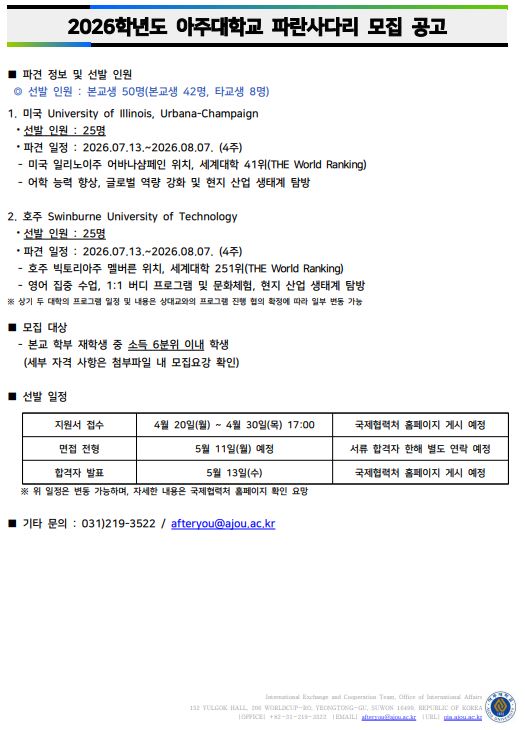 2026 아주대학교 파란사다리 프로그램에 참여할 학생들을 모집합니다. 학생들의 많은 관심과 지원 바랍니다.